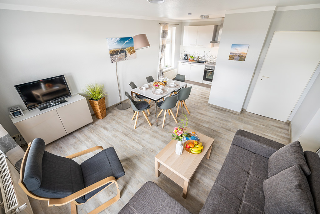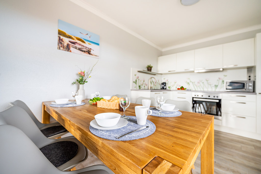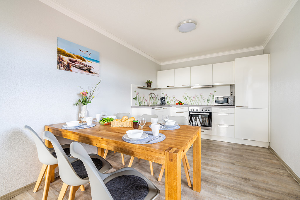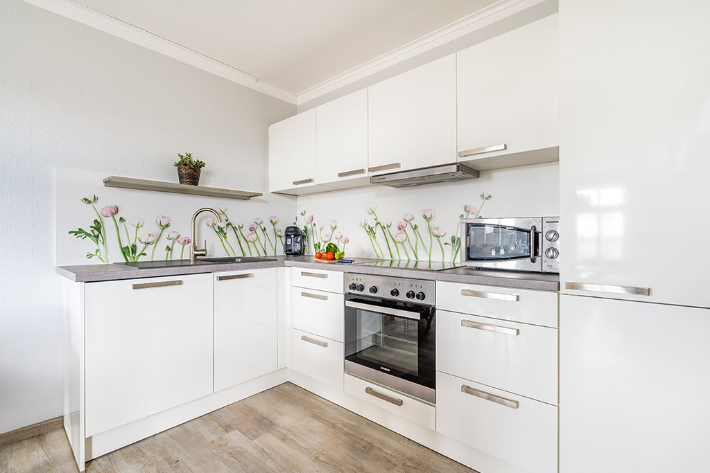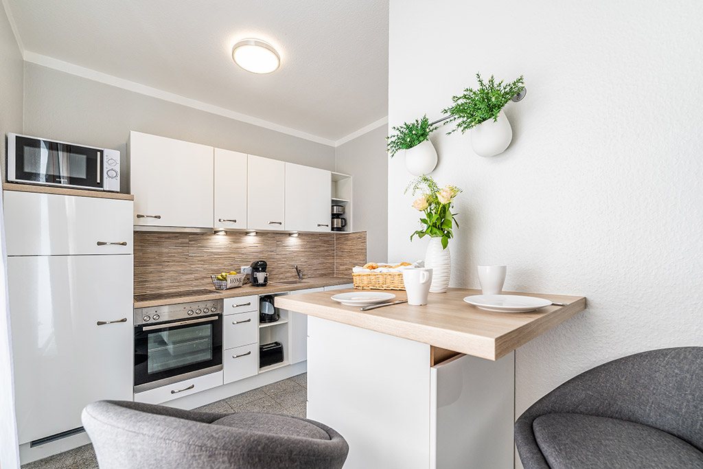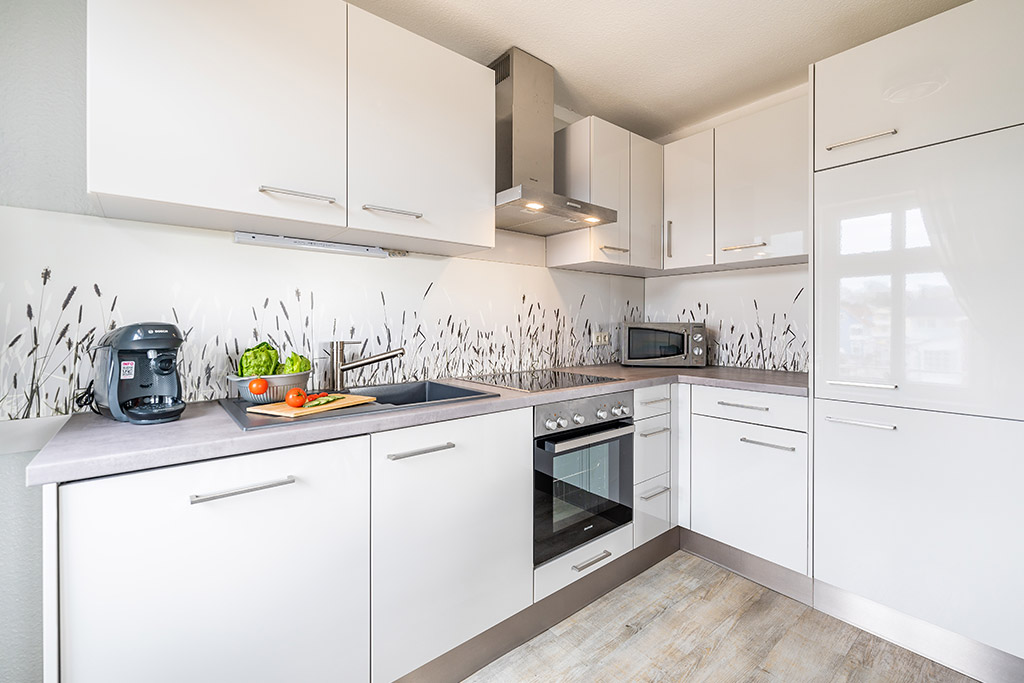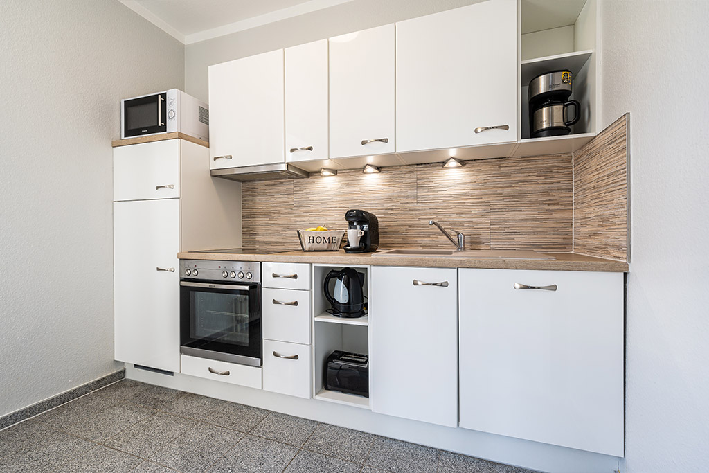 • komplett eingerichtete Wohnküche mit Geschirrspüler, Kühlschrank mit Gefrierfach, Tassimo-Kapselkaffeemaschine, Backofen, Mikrowelle, Kaffeemaschine (Filter), Wasserkocher, Toaster