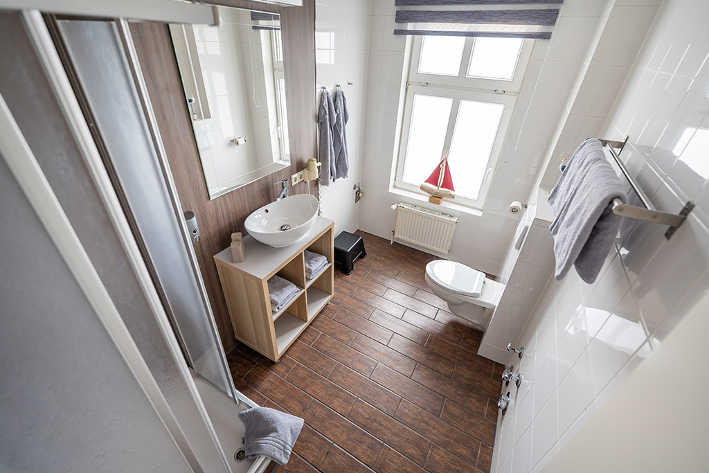 • Badezimmer mit Dusche und WC, Haartrockner und Seifenspender